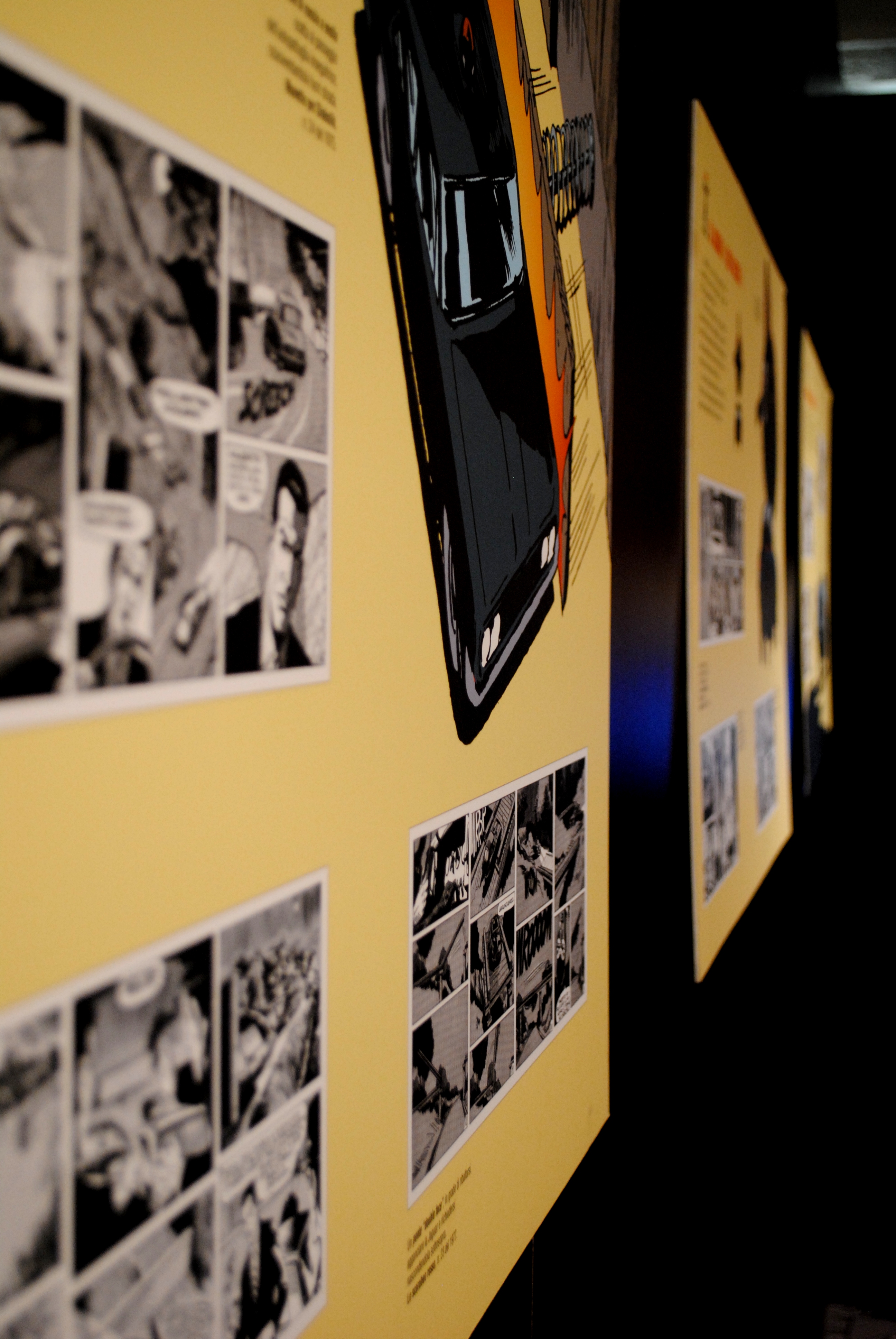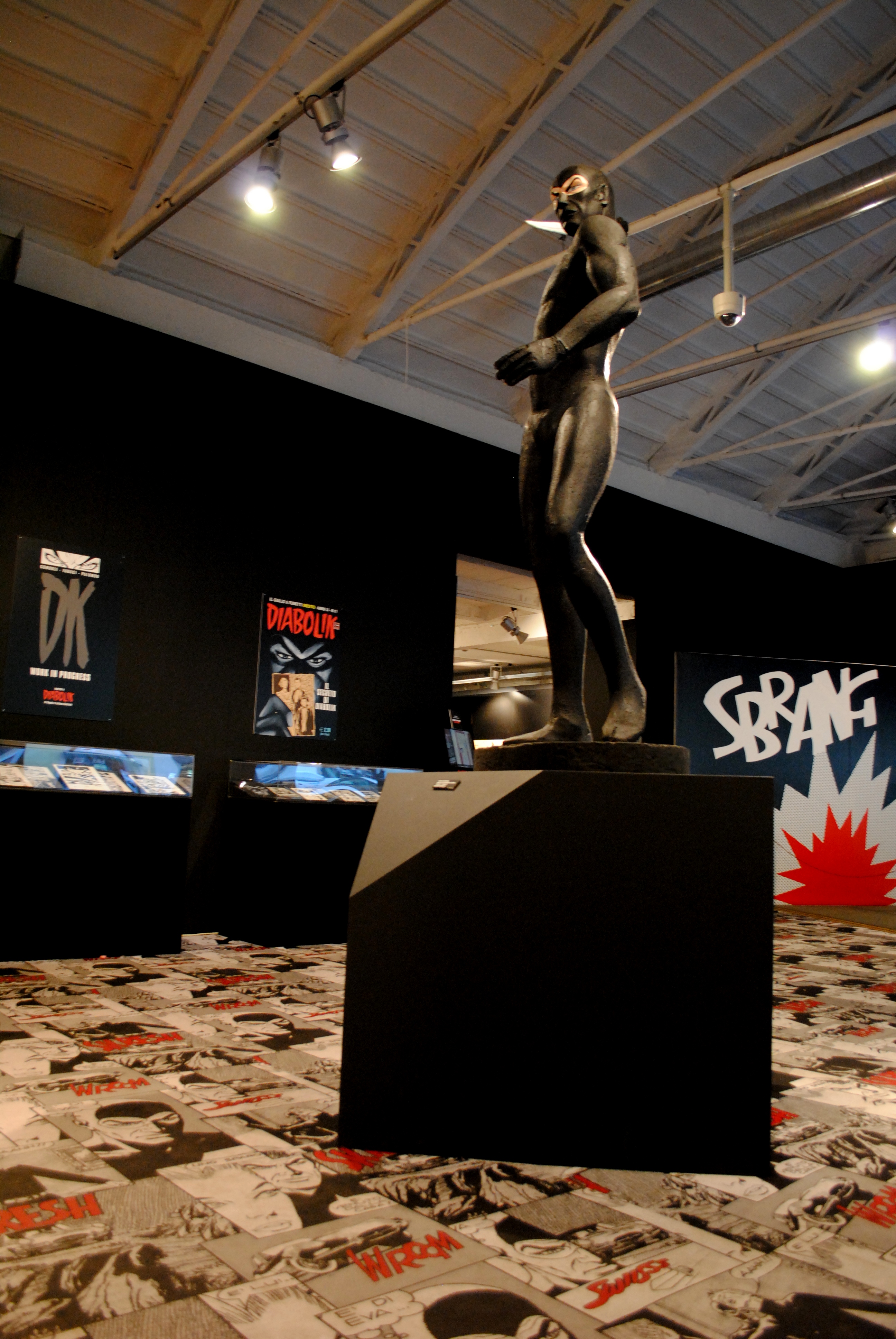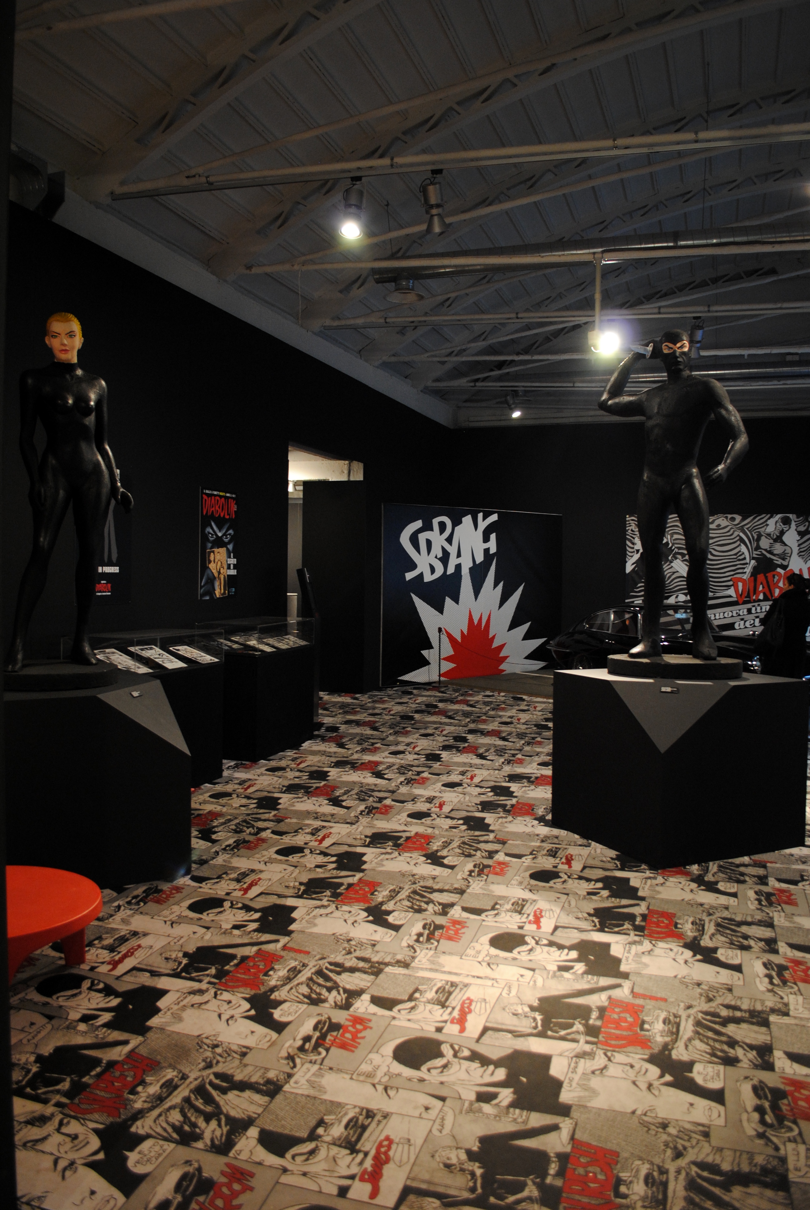 Appena entrati si è accolti dalle gigantografie della coppia dei criminali ma anche dell’ispettore Ginko, situato dietro la famosa Jaguar E-Type nera con interni rossi. Proseguendo si incontra uno spazio dedicato alla tecnologia utilizzata nelle storie: d’altronde siamo in un museo che si occupa anche di questo e nonostante Diabolik non sia un fan della tecnologia moderna, non può farne a meno.