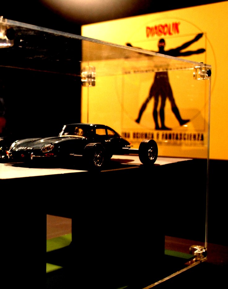 Ed ecco tutte le modifiche applicate alla sua macchina ed illustrate attraverso le tavole stesse del fumetto applicate sotto le teche che racchiudono il modellino della Jaguar. Ma non è solo l’auto l’arma vincente per sfuggire alla polizia, anche dal punto di vista chimico è ben attrezzato: acidi, veleni, gas soporiferi istantanei…per non parlare delle numerose maschere utilizzate per confondere coloro che sono sulle sue tracce.