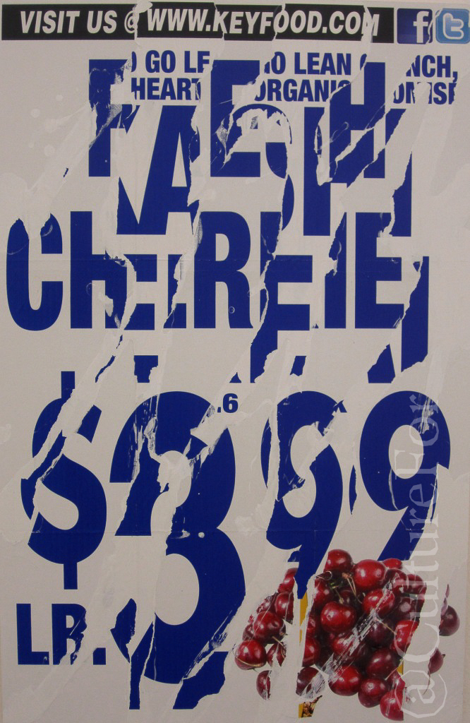 Infine, sono esposti anche i nuovi lavori ovvero dei dipinti realizzati usando le locandine dei supermercati…un lavoro che ci ricorda molto….ah, sì…ecco…Mimmo Rotella! (Ancora in mostra al piano superiore della stessa galleria)