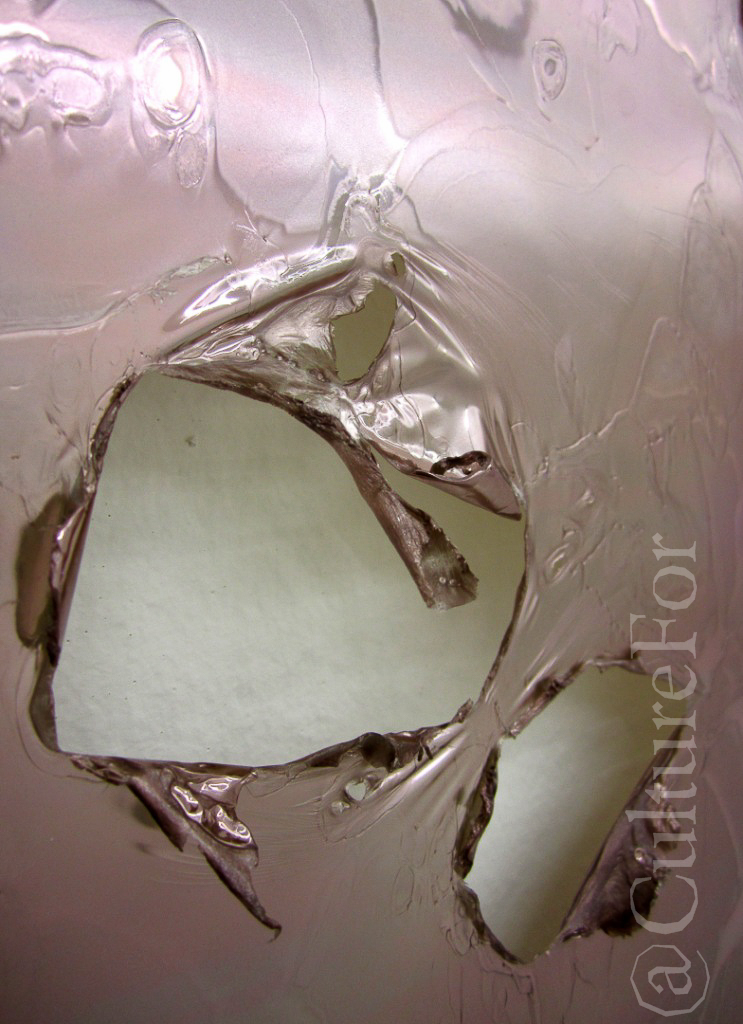 I due lavori simili si caratterizzano per l’utilizzo di due materiali diversi: alcune opere vengono realizzate con la pellicola in poliestere per  finestre (PET) di color bronzo, riflettente e la cui funzione principale è quella di ridurre il passaggio di raggi UV  e infrarossi. Questa pellicola, però, non è stesa in maniera uniforme; ci sono, infatti, degli squarci, come delle bruciature che fanno sciogliere il materiale: dovrebbero servire per regolare il flusso di energia, ma con quei buchi riusciranno nel loro intento?