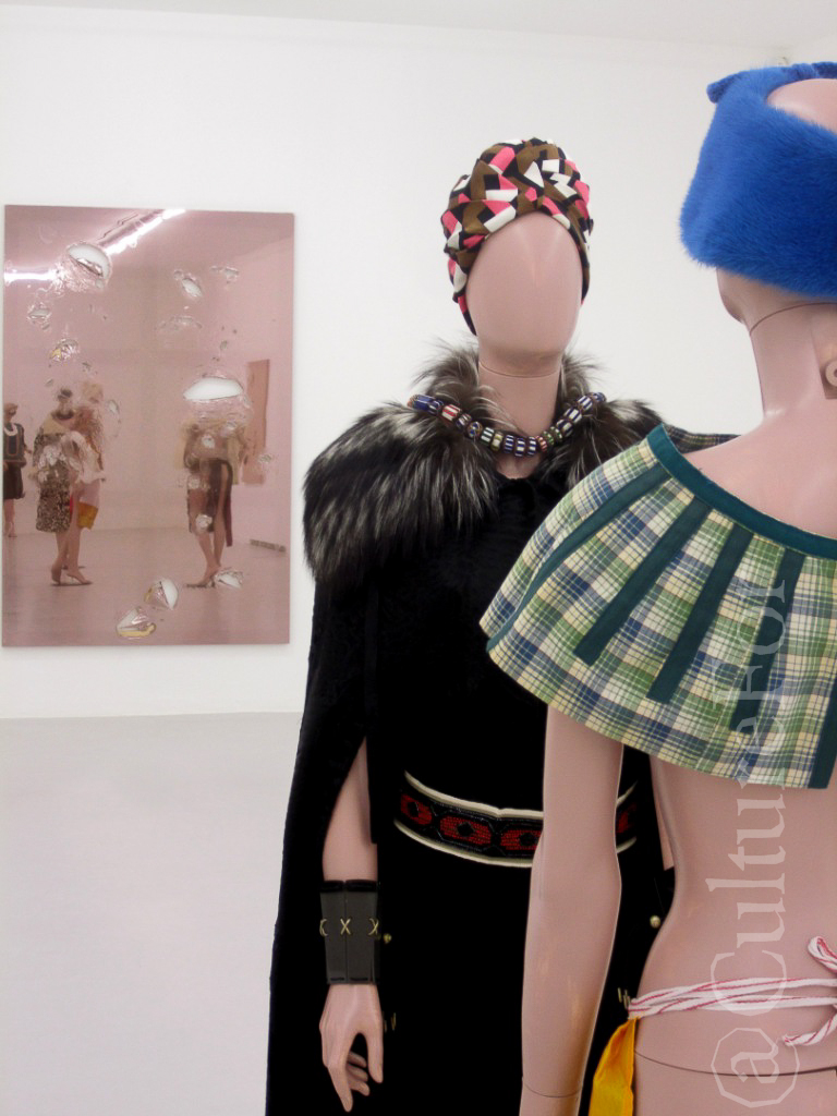 Inoltre ci sono opere concepite insieme ad un’artista/designer: Nina Yashar. Si tratta di manichini con indosso “abiti” (se così li possiamo chiamare) molto particolari; fungono da spettatori ma, allo stesso tempo, intralciano lo spazio, sono lì in mezzo e li si vede riflessi nelle opere in PET da ogni angolazione.