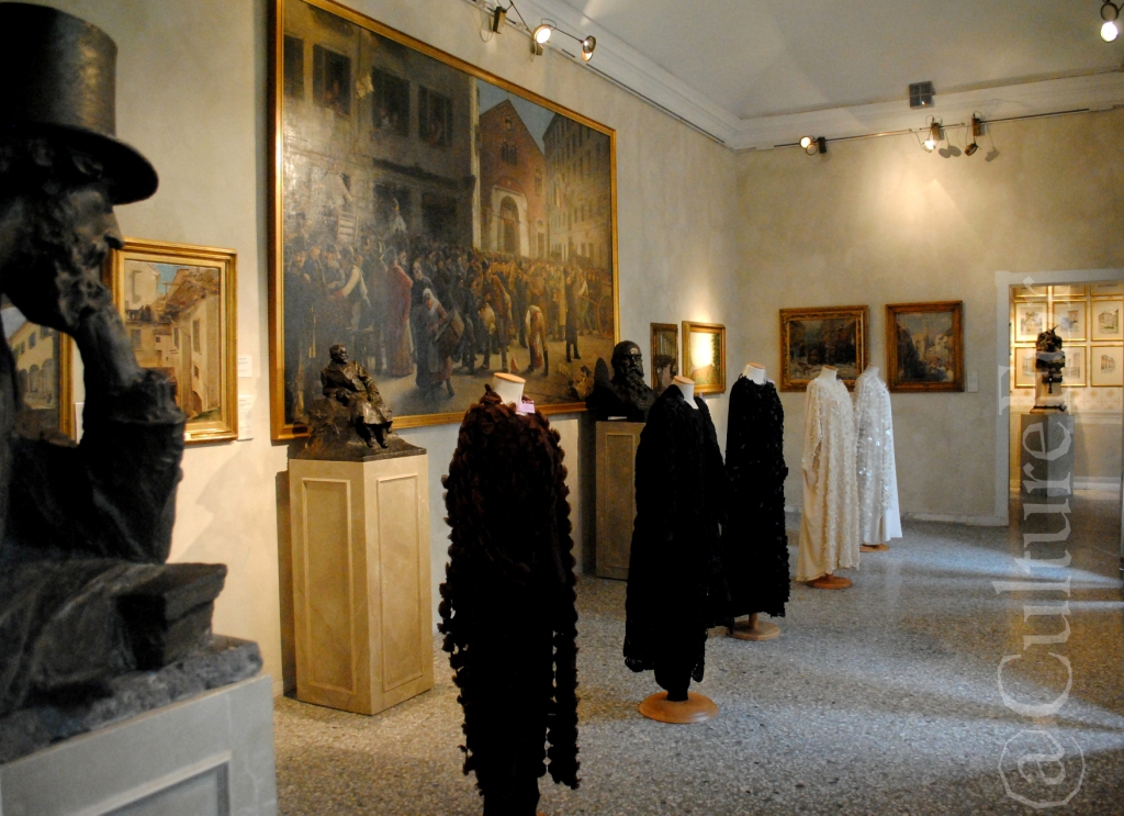Una cinquantina di abiti esposti in maniera da armonizzarsi con il contesto dell’antico palazzo: abiti fiorati nella sala con esposte opere paesaggistiche, strascichi e luccichii nella stanza dove marmi e stucchi prevalgono.