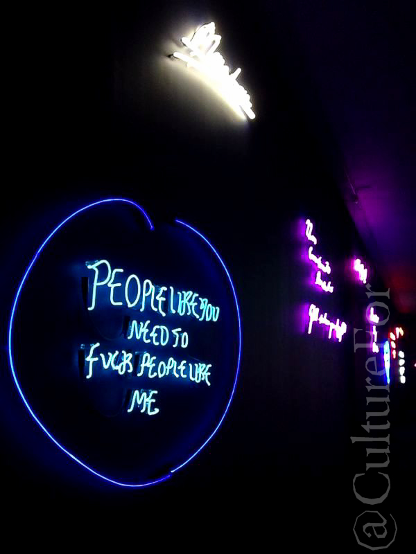 Si tratta di scritte al neon, più o meno provocanti, appese alle pareti nere di questa enorme sala: sicuramente un allestimento d’effetto, ma durante la visita non siamo riuscite a coglierne il senso. Materiale informativo assente alla biglietteria dove la ragazza, pur essendo molto disponibile, non ha saputo rispondere alle nostre domande.