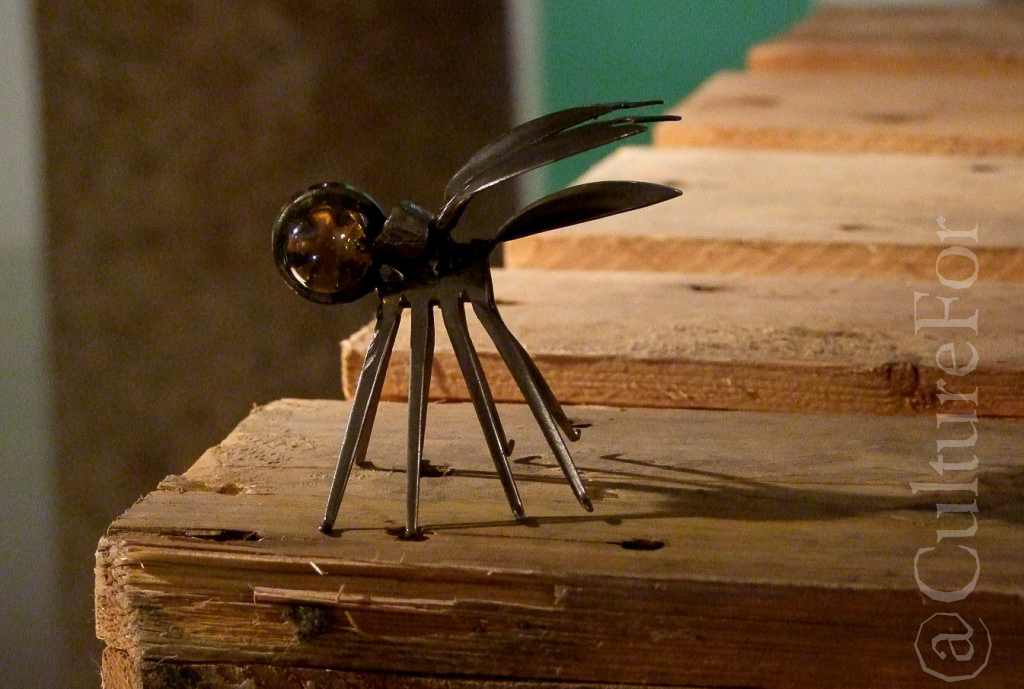 Entrare in questo spazio vi trasporterà in una raccolta di racconti, i cui protagonisti sono strane creature, dove l’ambiente è decorato con tele fatte di legno, pietra e plastica. Dove il colore abbonda ma è equilibrato al tempo stesso. Dove scolapasta, bottiglie e ruggine assumono un significato nuovo.