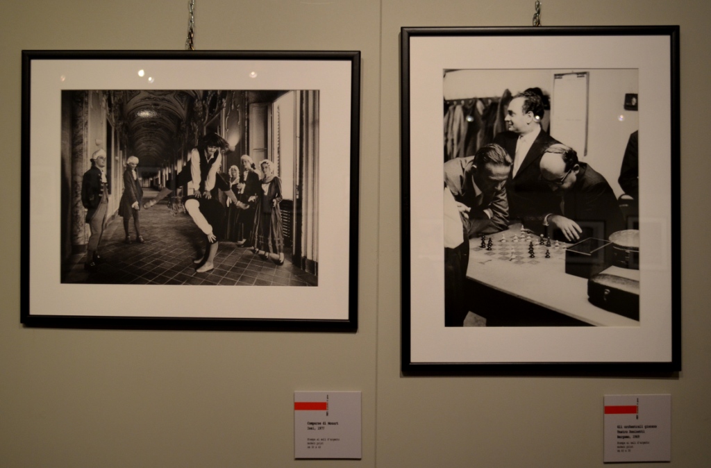 Oltre ai bambini, ci sono i momenti di giochi per gli adulti e Pepi Merisio ne immortala alcuni come ‘i giocatori di scacchi’ che altro non sono che degli orchestrali in pausa dietro le quinte del Teatro Donizetti, ma anche le comparse di un’opera di Mozart che tra una prova e l’altra giocano alla “cavalletta” nei corridoi dei palazzi.