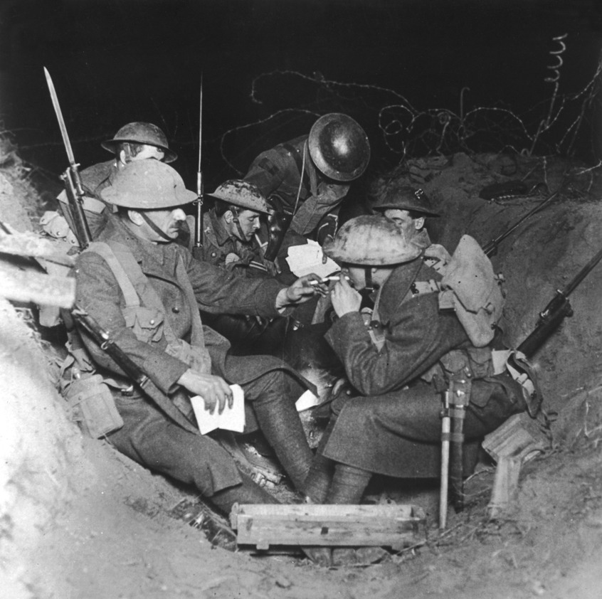 British troops resting and lighting a cigarette at Beaumont Hamel, Somme, on the Western Front in France during World War I in 1917 Date: 1917