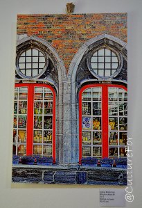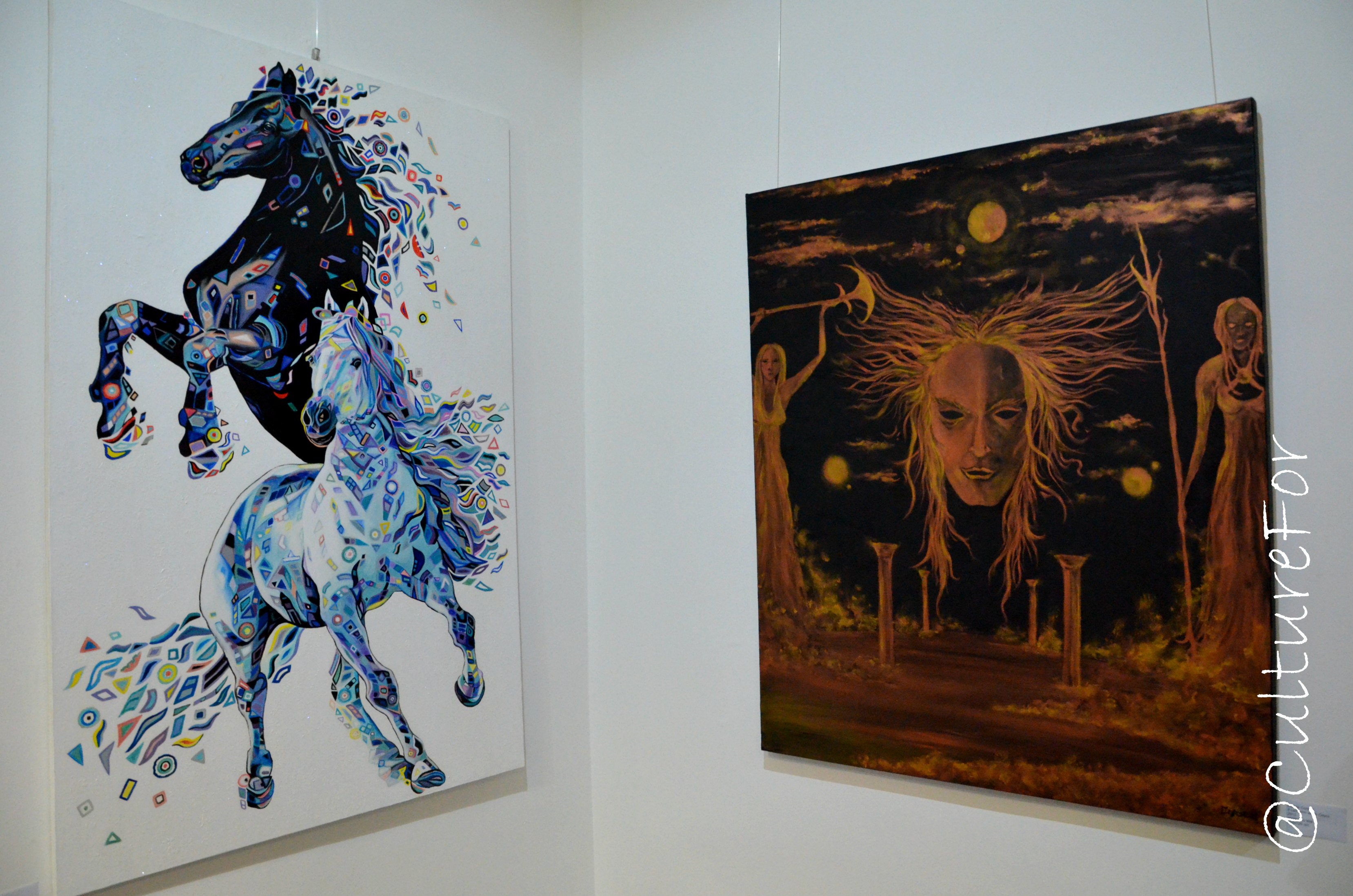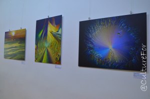Ecco poi un disegno ispirato alla mitologia di Davide Corseri: qui vediamo Crono, padre di tutti gli dei. I colori metallizzati utilizzati per la sua realizzazione riflettono la luce in maniera sempre diversa. Accanto  invece c’è il luminosissimo quadro di Irina Markova: i soggetti sono interamente da ricami geometrici sfavillanti.