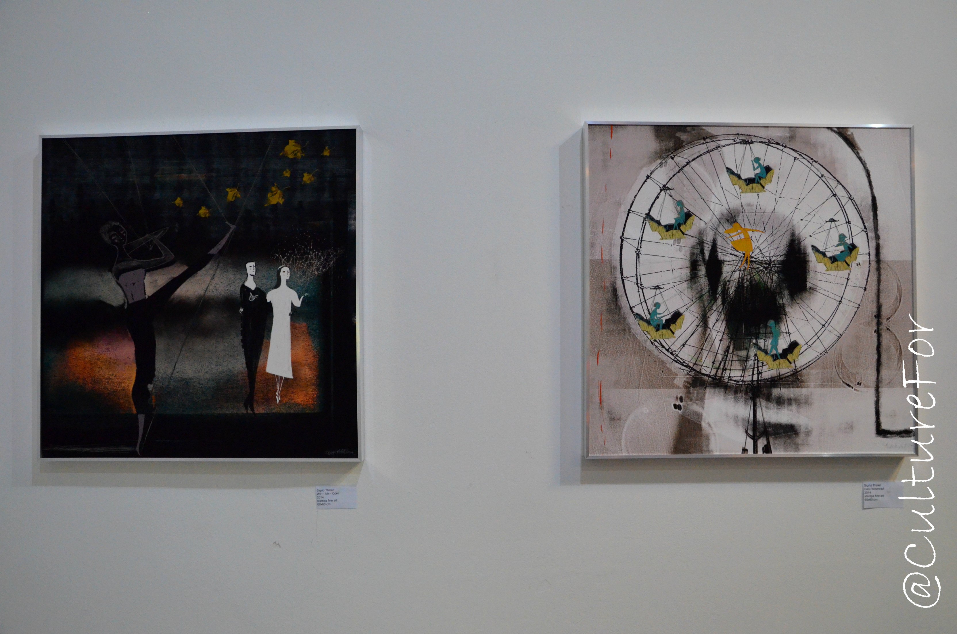 Sembra di entrare in un libro di favole con le opere di Sigrid Thaler: personaggi stilizzati e mondi surreali, il tutto in perfetto equilibrio. Un mondo delle favole, ma più cupo, quello di Tamara Ramos: un ritratto e un autoritratto stampa su legno, dove i volti sono in ombra in attesa dell’arrivo della luce per mostrarsi a tutti.