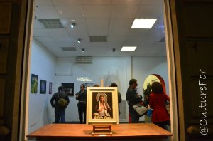 Molto forte il quadro esposto in vetrina, lavoro di Giorgia Rizzo. A prima vista sembra una Madonna, ma in realtà è un autoritratto dell’artista che denuncia il femminicidio attraverso simboli di violenza.