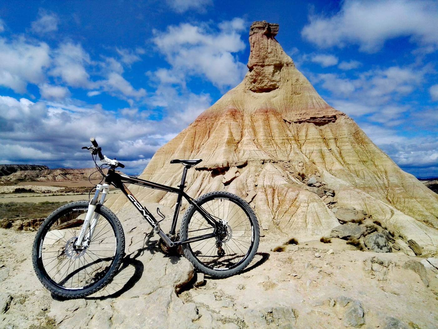 Abbiamo seguito un percorso consigliatoci dal signore che ci ha affittato le biciclette: un anello di quasi 40 km, quasi tutti su sterrato. Le Bardenas Reales possono dividersi (semplificando molto) in 3 zone principali: Bardena Blanca, Bardena Negra e Il Plano. Noi siamo rimasti nella zona della Bardena Blanca, la più desertica, caratterizzata da canyon, distese di sale e particolari formazioni rocciose create dall’azione degli agenti atmosferici.
