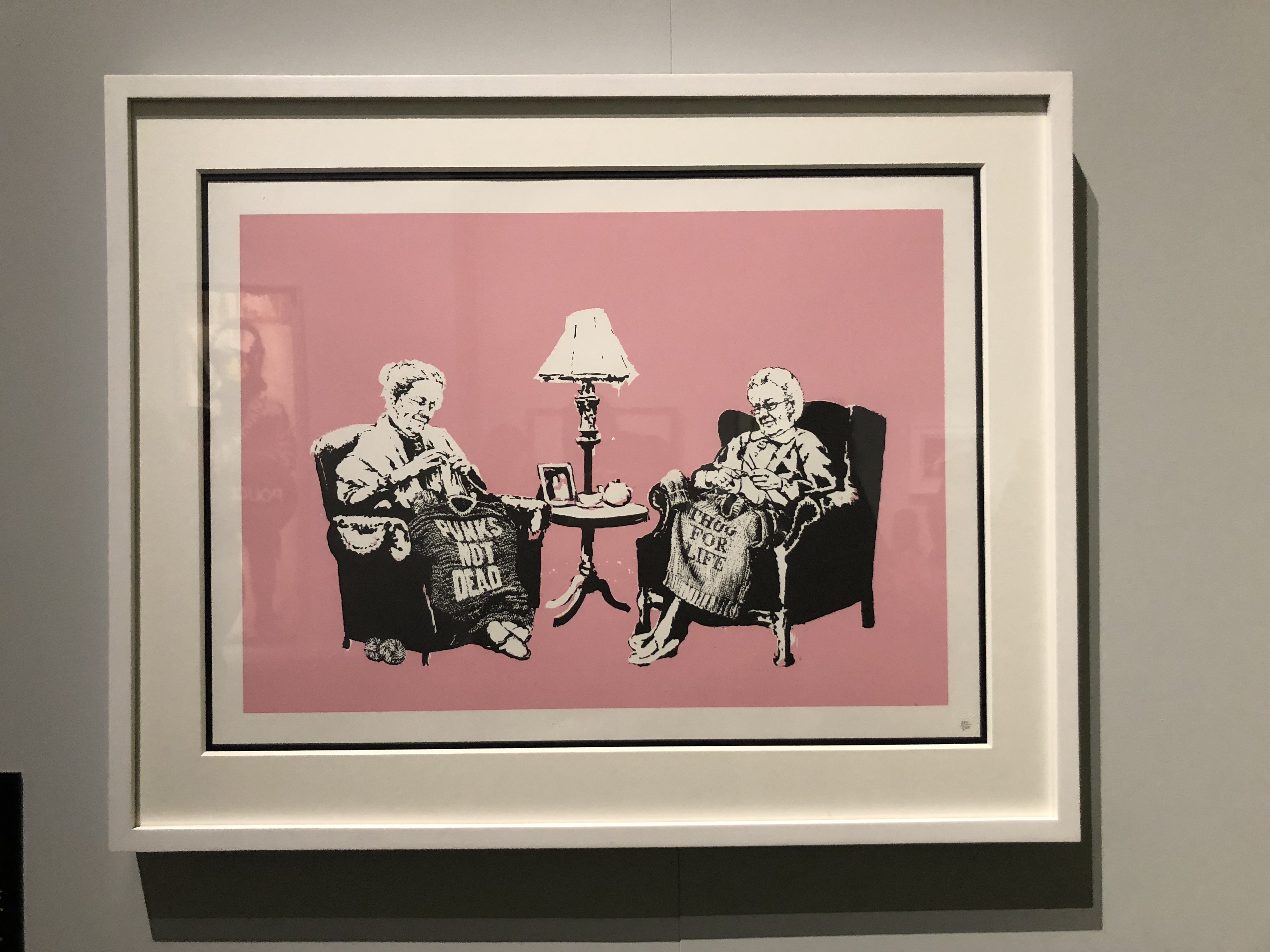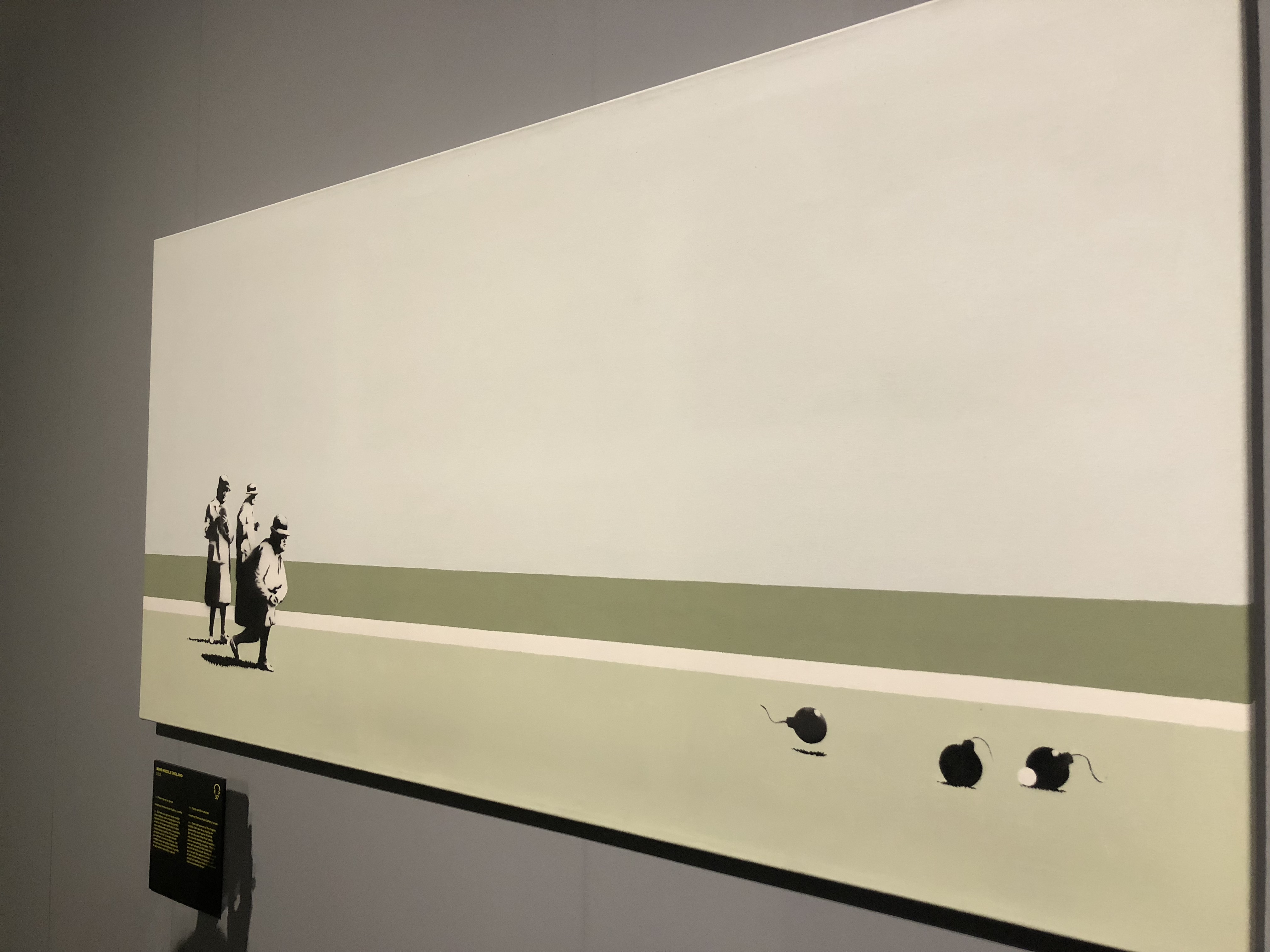 A seguire, una carrellata dei suoi lavori più iconici e che ormai sono entrati a far parte dell’immaginario collettivo. Dalle opere di protesta contro l’establishment inglese, dove la Regina Elisabetta viene rappresentata come una scimmia, poi con una maschera antigas…alle opere di sensibilizzazione contro la guerra, tra cuiil gruppo di signore che gioca a boccia con delle bombe.