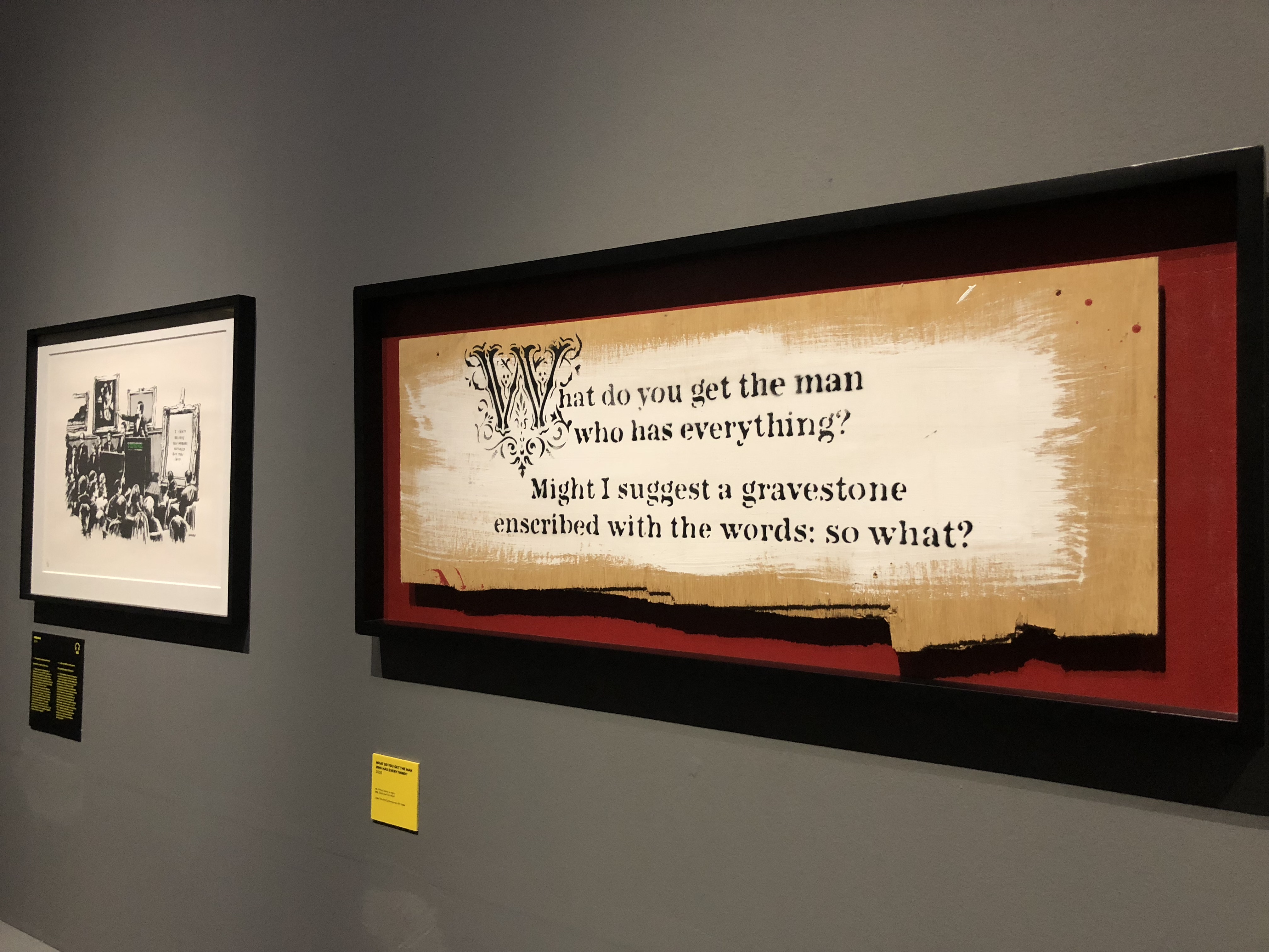 A Visual Protest. The Art of Bansky raccoglie 80 lavori tra dipinti, stampe numerate, oggetti, video, fotografie, vinili e memorabilia con un unico obiettivo: raccontare la protesta dell’artista nei confronti della società, dalle guerre al consumismo. La mostra inizia con un breve excursus dedicato ai quei “movimenti” che, a partire dagli anni ’50 e ’60, hanno dato il via alla protesta attraverso l’utilizzo di parole e immagini.