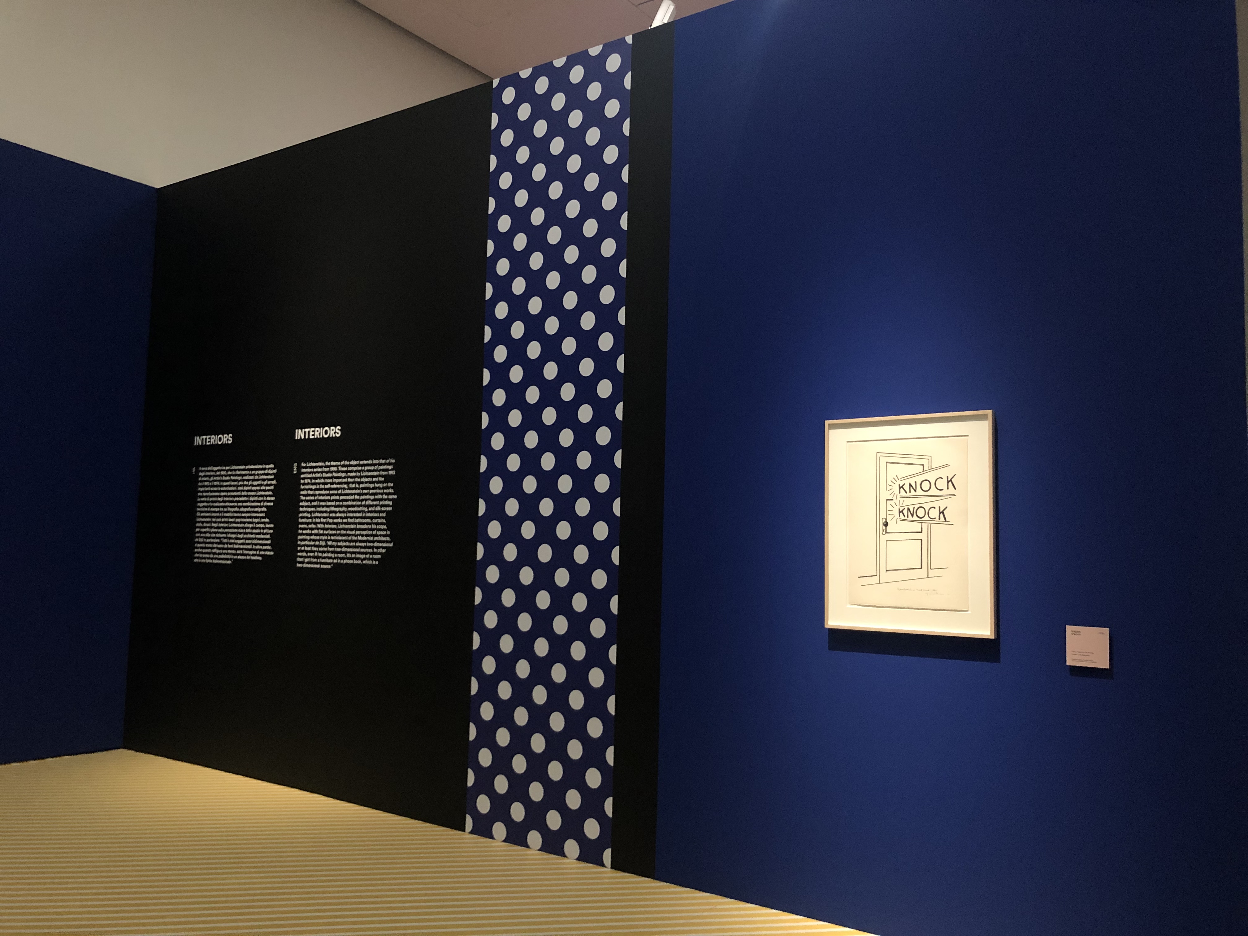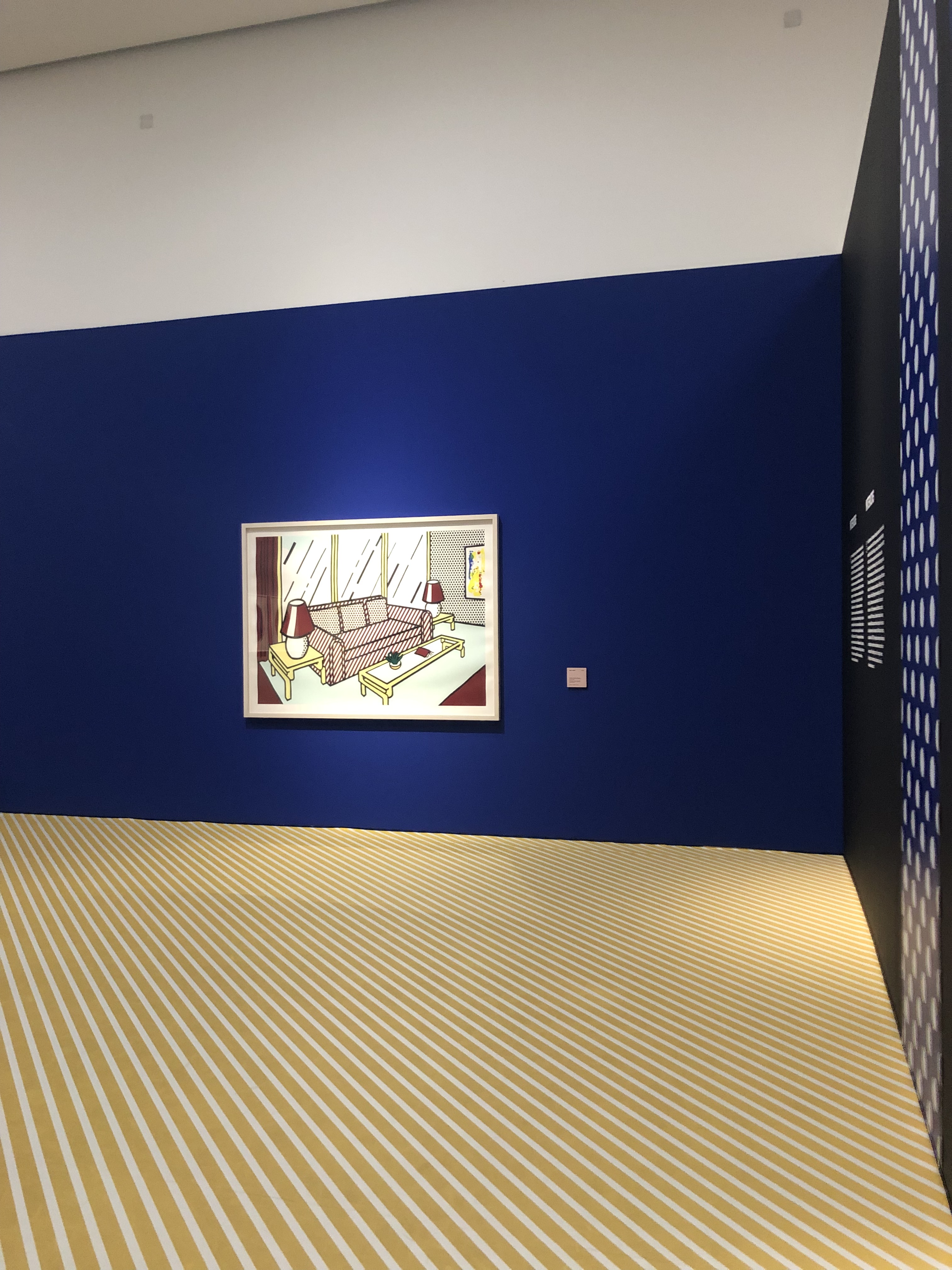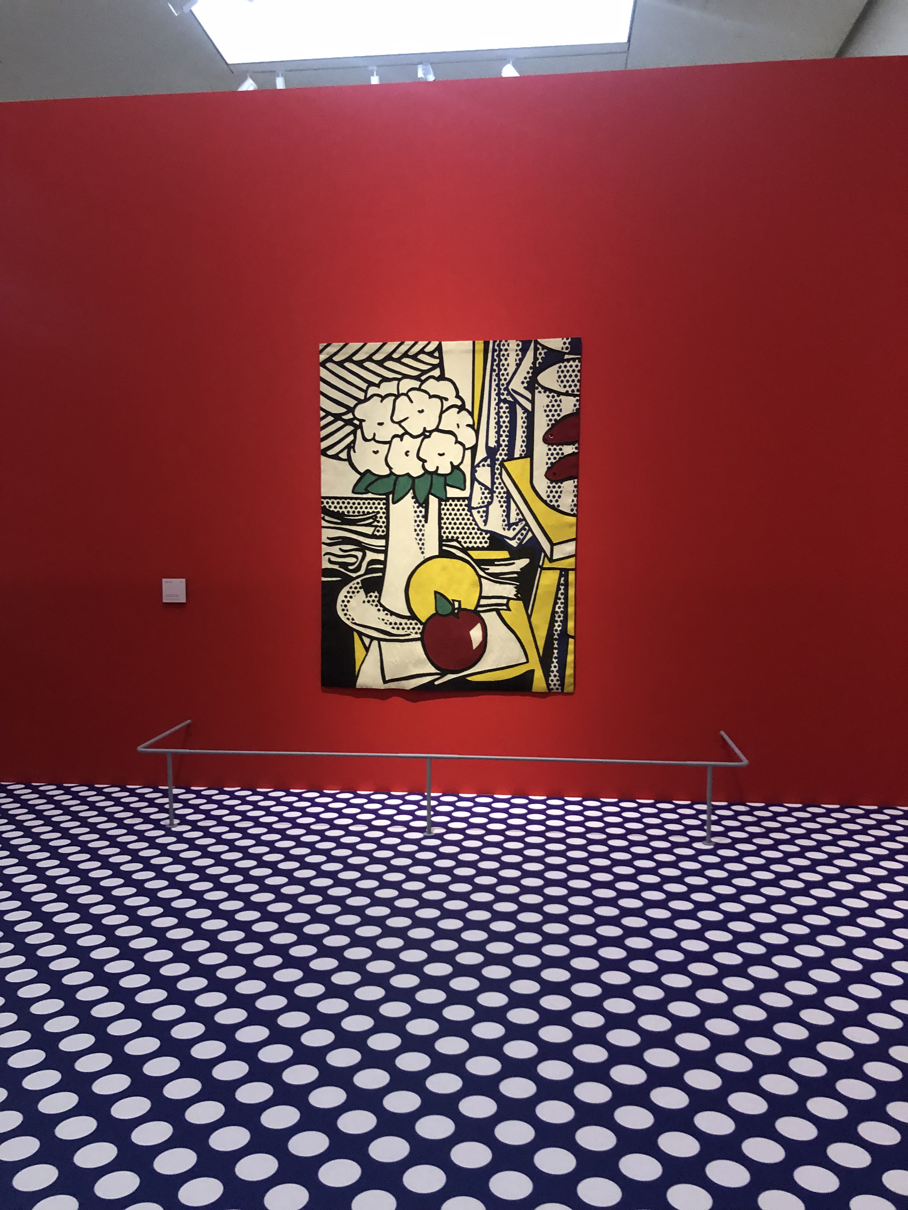 L’allestimento è pulito e allo stesso tempo divertente: ogni sezione è introdotta da uno dei suoi tipici pattern, per poi lasciare spazio ai colori delle opere su uno sfondo grigio che le risalta perfettamente. Ho apprezzato molto il fatto che non si trattasse di una mostra buia con i punti luce indirizzati solo sulle opere (come succede sempre più spesso negli ultimi anni), ma la luce era morbida e lasciava pochissimo spazio alle ombre.
