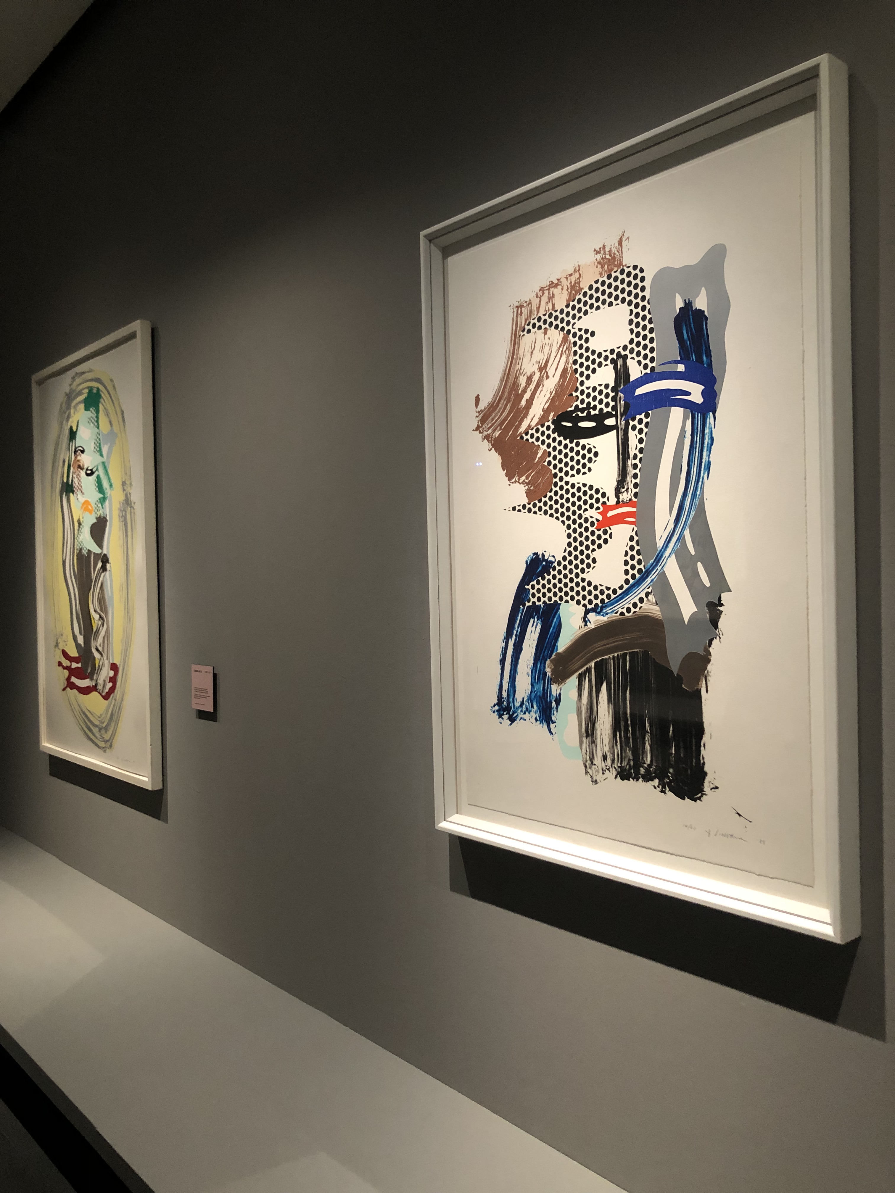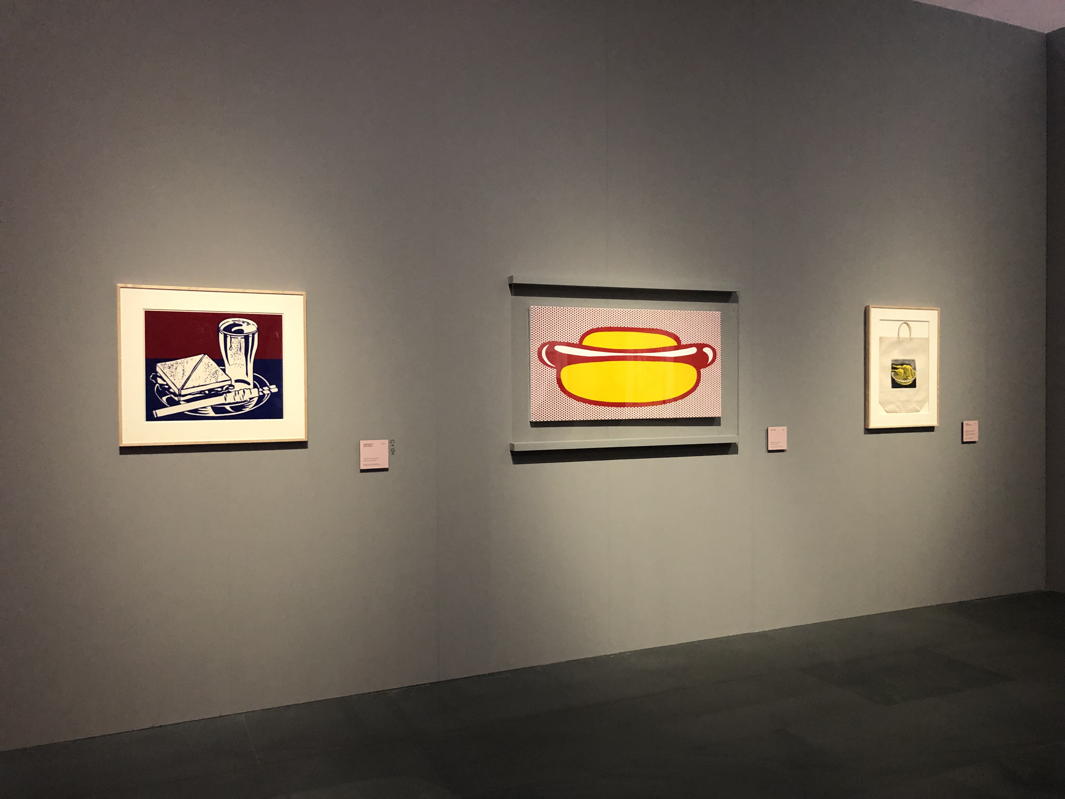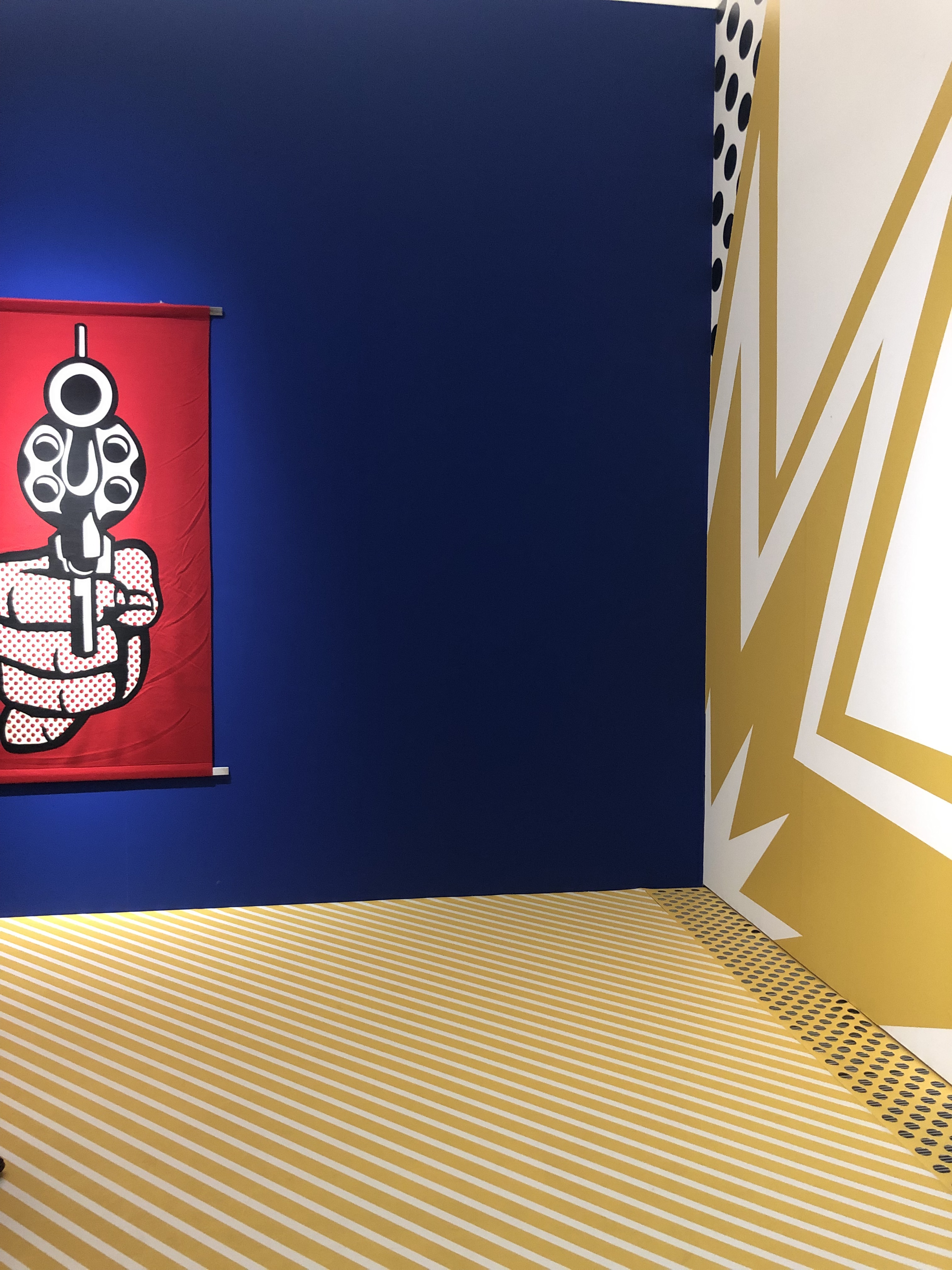 L’allestimento è pulito e allo stesso tempo divertente: ogni sezione è introdotta da uno dei suoi tipici pattern, per poi lasciare spazio ai colori delle opere su uno sfondo grigio che le risalta perfettamente. Ho apprezzato molto il fatto che non si trattasse di una mostra buia con i punti luce indirizzati solo sulle opere (come succede sempre più spesso negli ultimi anni), ma la luce era morbida e lasciava pochissimo spazio alle ombre.