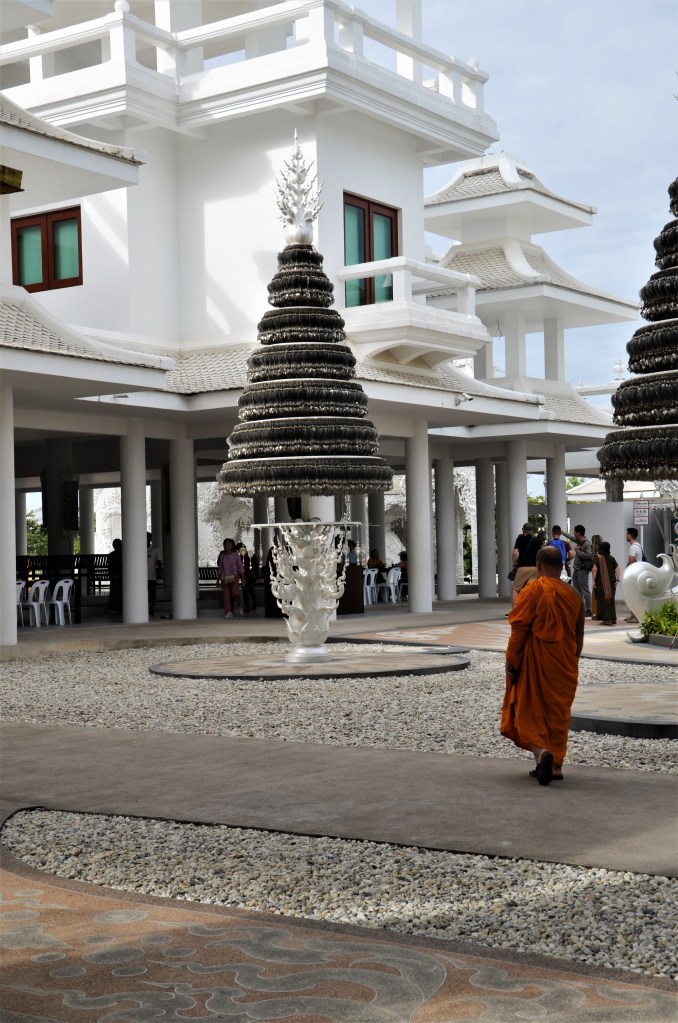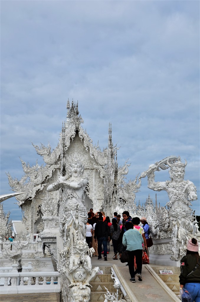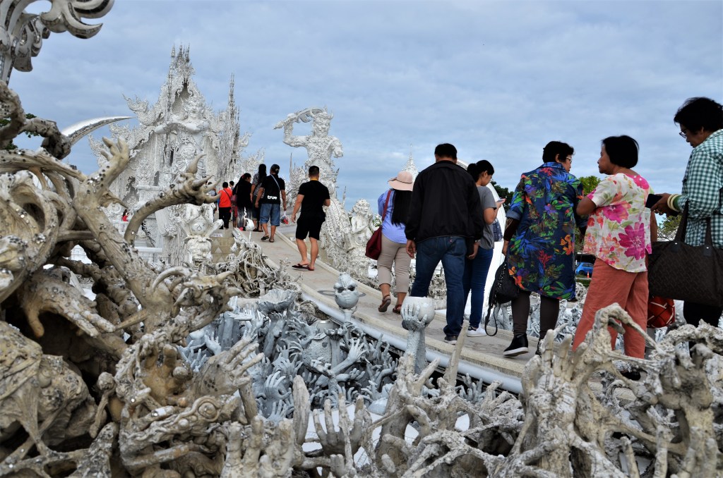 Un tripudio di gesso bianco e specchietti che riflettono la luce del sole: sono questi gli elementi caratterizzanti che l’artista Chalermchai Kositpitat ha scelto quando ha dato il via alla costruzione del tempio nel 1997. Il risultato ad oggi (già, il complesso non è ancora terminato) è molto particolare e, visitandolo, si può ripercorrere il pensiero buddhista: la sofferenza dell’esistenza raccontata dalla distesa di mani che sembrano volerti afferrare e trascinare nell’oscurità con loro, il passaggio – simboleggiato da un ponte su cui sono poste statue del dio della morte e dell’oscurità – dal mondo delle tentazioni a quella della liberazione, e infine le immagini di Buddha che accolgono il visitatore all’ingresso del tempio.