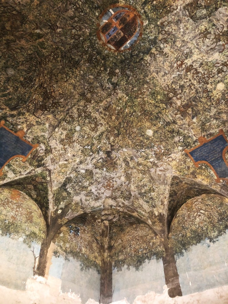 Sotto l’ombra del Moro. La Sala delle Asse è quella che mi è piaciuta di più. La Sala delle Asse si trova al piano terra della torre nord-ovest del castello e, dal 2013, è interessata da operazioni di restauro. In occasione dei 500 anni dalla morte di Leonardo Da Vinci, la sala è stata riaperta al pubblico. Si caratterizza per una decorazione che rappresenta un fitto intreccio di gelsi (da cui prende il nome la sala nel XV secolo, Camera dei Moroni), simbolo di richezza in quanto il gelso era utilizzato per la florida industria della seta. All’interno della sala sono posizionate delle sedute a gradinate che permettono di assistere a uno spettacolo multimediale fatto da proiezioni e ologrammi, raccontano la storia della Sala delle Asse.