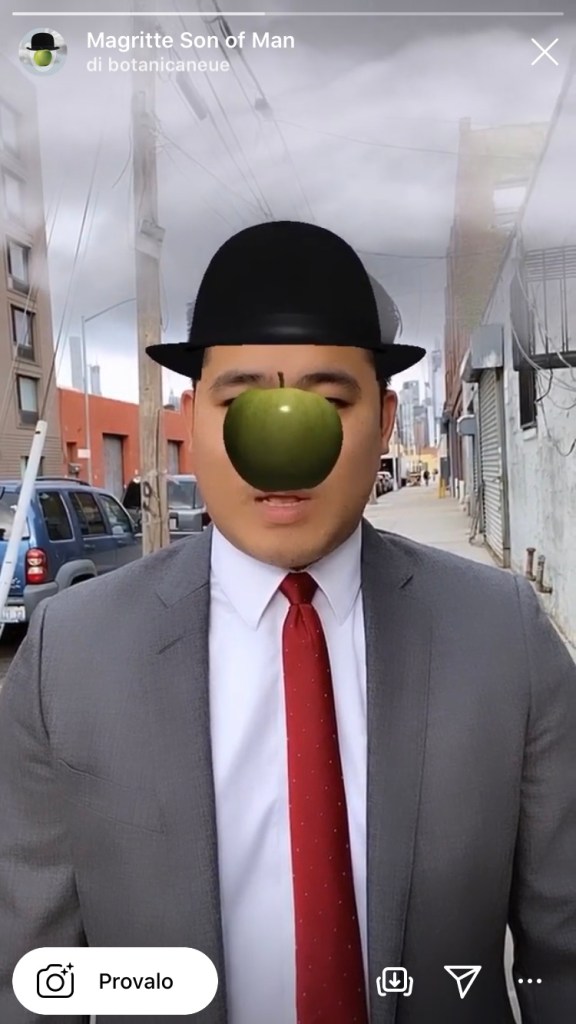 Sempre opera di Botanicaneue, sono altri due filtri che vi faranno diventare protagonisti rispettivamente di un ritratto alla maniera di Van Gogh oppure del quadro Il figlio dell’uomo di Magritte, grazie alla bombetta nera e alla mela verde posizionata di fronte al viso.